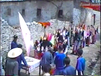 この門楼に似せて大布で作った門の形の前に全員が整列する。擬門の内側に方卓を置き、その上に、肉を入れた皿二つ、米を入れた皿二つ、水果を入れた皿二つを置く。